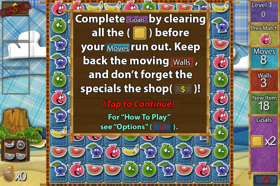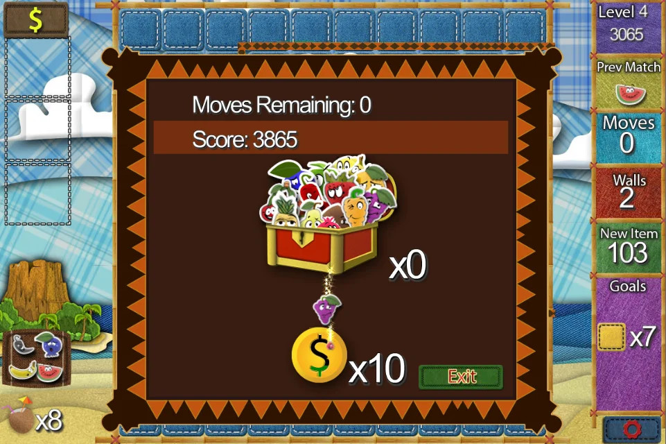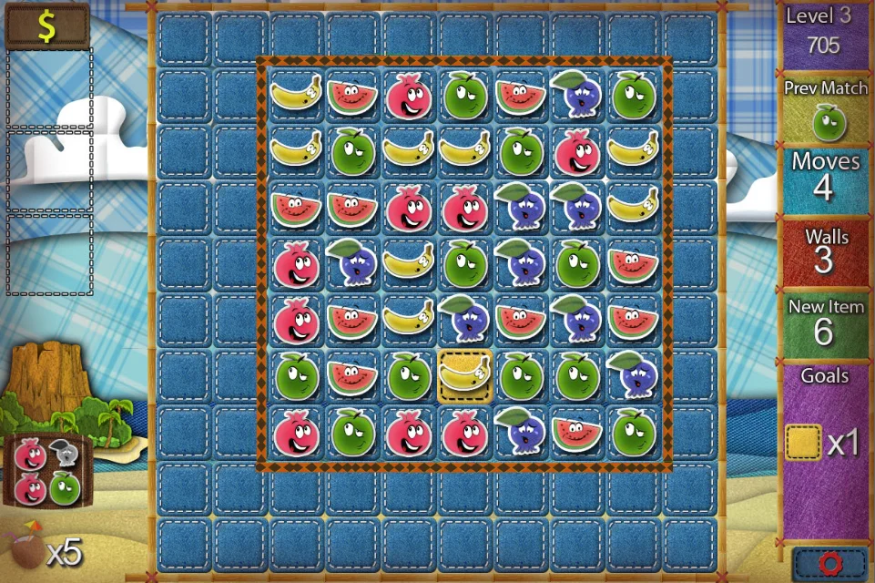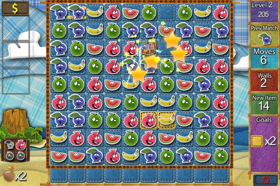 Play, switch, match and score points in this engaging Match-3 game with a light hearted theme. Move fruit to create matches of 3 or more to clear the goals before you run out of moves. Be careful and keep an eye out for the moving walls, erupting volcano, and evil tikis. It is easy to play and enjoyable to master.